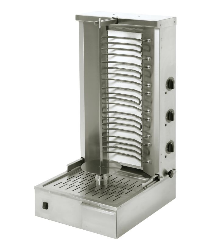 رولر جريل GR80E هو جهاز شاورما كهربائي عالي السعة مصمم للمطابخ التجارية المزدحمة والمطاعم وعمليات التموين. يمكن لهذا الطراز القوي الذي يوضع على الطاولة شوي حتى 40 كجم من اللحوم دفعة واحدة، ويتميز بعناصر تسخين كهربائية قوية لطهي سريع ومتساوٍ مع نكهة شاورما أصلية. يضمن السيخ الرأسي تحميصاً منتظماً، بينما يوفر الهيكل المصنوع من الستانلس ستيل المتانة وسهولة التنظيف. مثالي لتحضير الشاورما والدونر كباب والجيروس في بيئات تقديم الطعام ذات الحجم الكبير في الإمارات ودول مجلس التعاون الخليجي وأفريقيا وجنوب آسيا. موزع معتمد / المورد الرائد في دول مجلس التعاون الخليجي – الإمارات العربية المتحدة، عمان، قطر، والبحرين.